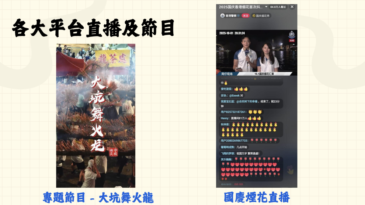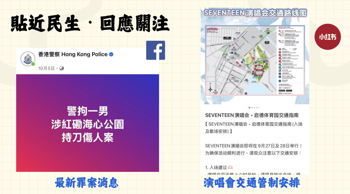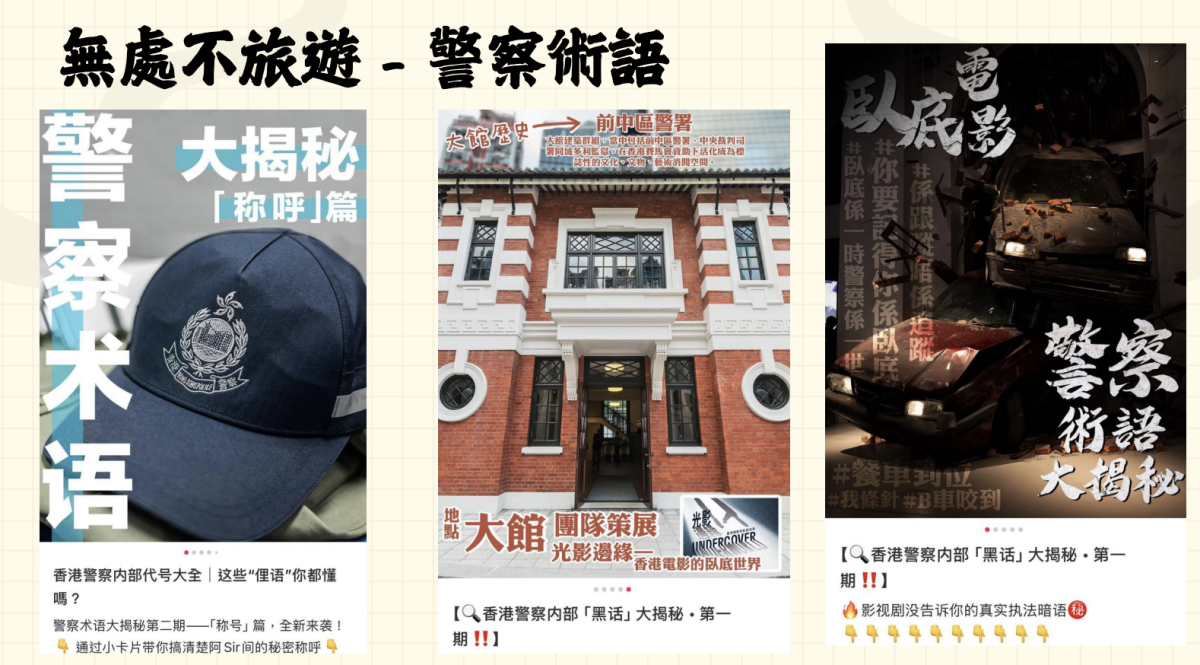 此外,警隊響應政府「無處不旅遊」政策,推出創新系列「守城映文」及「警察術語」,透過文體旅局的介紹和攻略,展現警隊如何融入市民生活,默默守護各類文化活動。如今,小紅書訂閱人數已達41.6萬,在政府部門的賬號中相當可觀,已有其他部門利用警方的平台發布訊息,以觸達更廣泛的群眾。