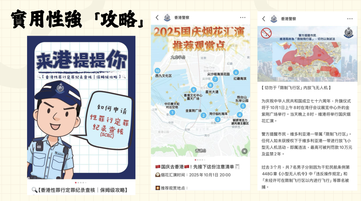 據悉,警隊是首批進駐小紅書與抖音的部門,警方針對這兩個平台進行深入分析後,發現其中小紅書用戶以年輕群體為主,女性比例較高,且偏好實用性攻略內容。因此警隊採用「帶貨」形式,推廣防詐騙與社區安全資訊,如國慶煙花觀賞點攻略、提醒網民維港一帶的無人機禁飛區等,希望能給內地或來港人士了解香港特色,同時帶出香港的法例避免觸犯。