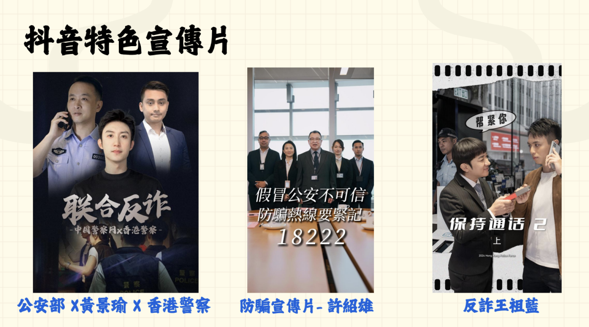 抖音方面,因其平台風格較為輕鬆,因此警方製作了符合抖音特色的影片,採用創新風格提升傳播效果,主要覆蓋18至45歲的群體,例如與公安部、許紹雄等合作製作短片宣傳防騙;希望憑藉他們的影響力,將最新防騙資訊更有效地傳達至市民。而警隊抖音平台即將迎來兩周年,過去一年在全國政務號粉絲增長排名中,榮獲第3名的佳績,粉絲人數即將突破500萬。警隊透露,將於11月19日推出兩周年紀念影片,屆時會有重量級嘉賓參與。