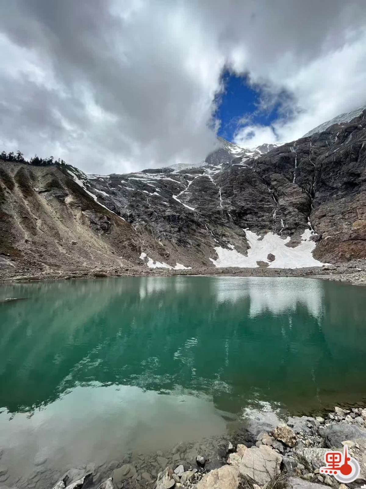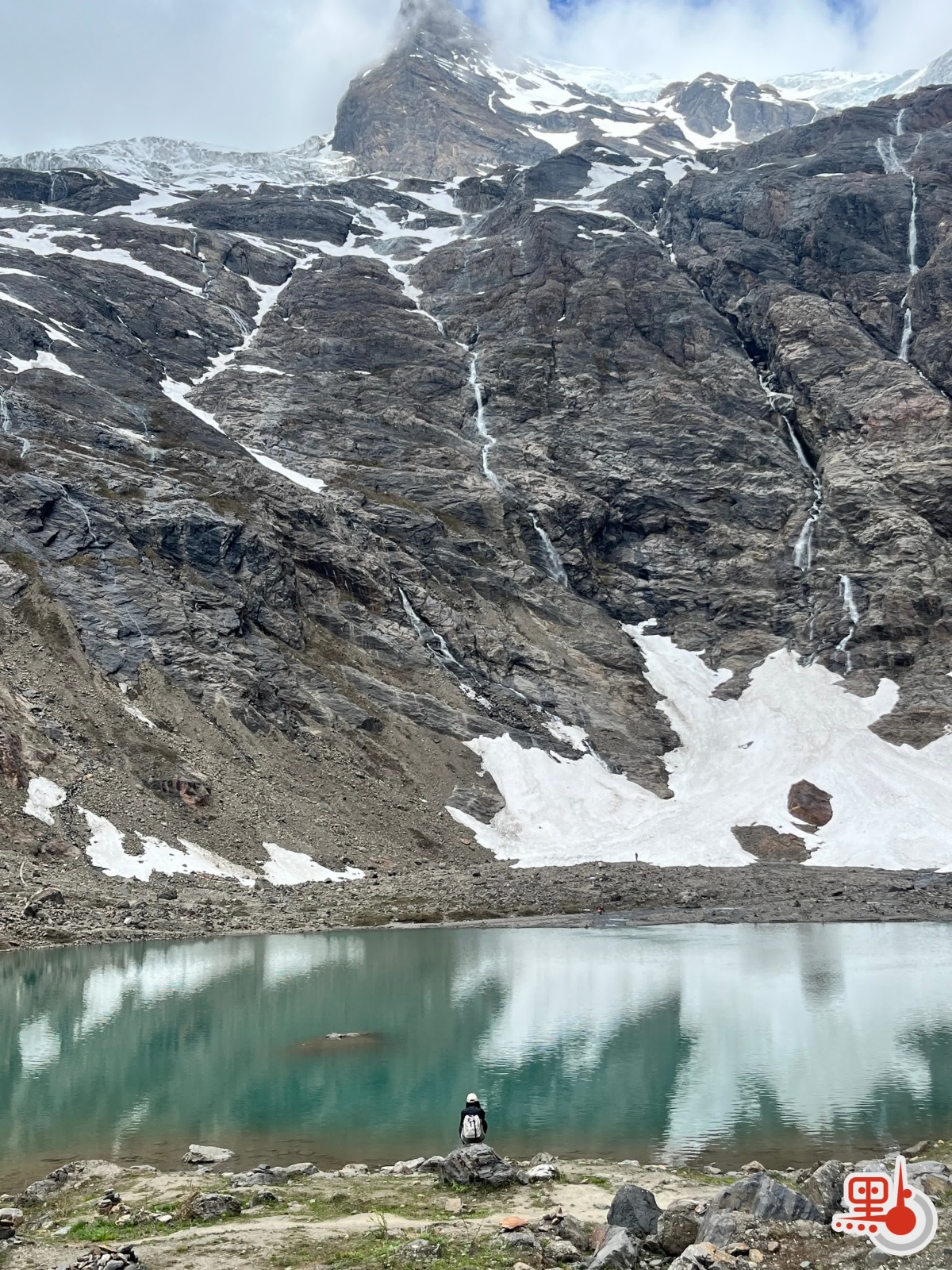 雖名為「冰湖」,它卻更似一泓碧藍的池水,直徑不過數十米。湖水乳白帶青,泛着淡淡的翠光;而在湖之上,巴烏八蒙的鋸齒山峰高聳天際,冰川半覆山腰。若說聖瀑象徵着心靈的洗滌,那麼冰湖便是靜思的所在。它給人的感受是一種莊嚴——不是冷峻的距離,而是一份溫柔的靜謐。