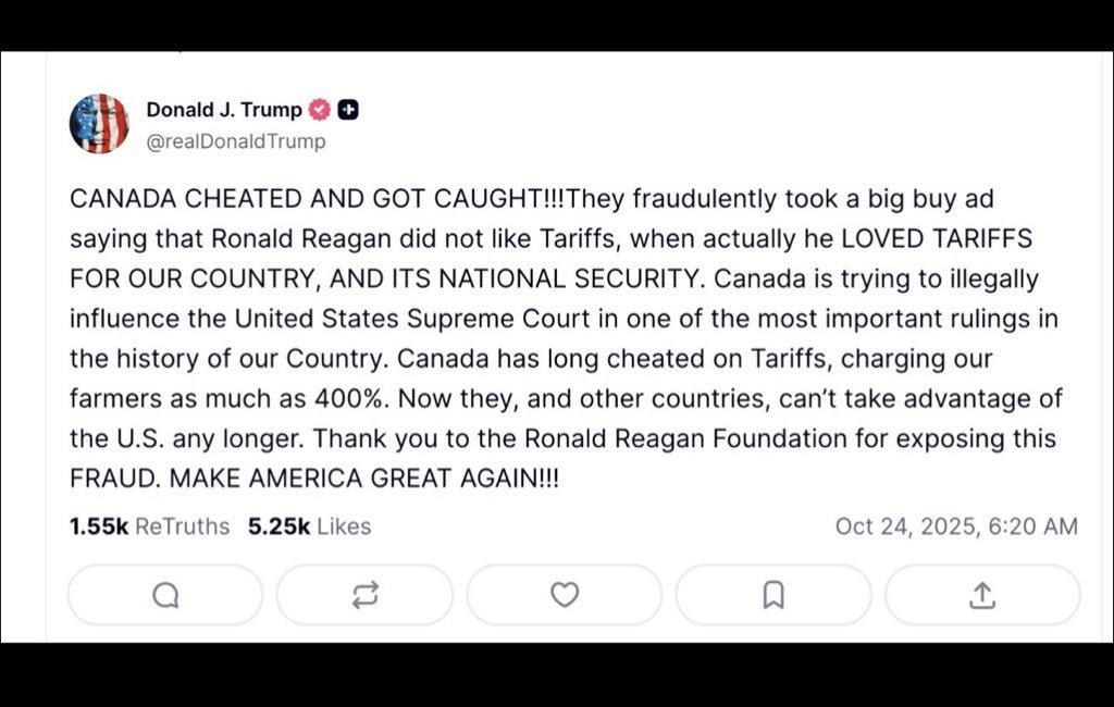 特朗普在社媒上表示,美國里根總統基金會當日稱,安大略省政府的廣告曲解里根的講話,該基金會剛宣布,這則廣告欺詐性地使用了里根總統的影片片段,偽造了他反對關稅的言論。這則廣告花費7500萬加元(約4.1億港元),他們這麼做只為了干預美國最高法院有關關稅政策的裁決,「基於他們的惡劣行為,與加拿大的所有貿易談判特此終止。」