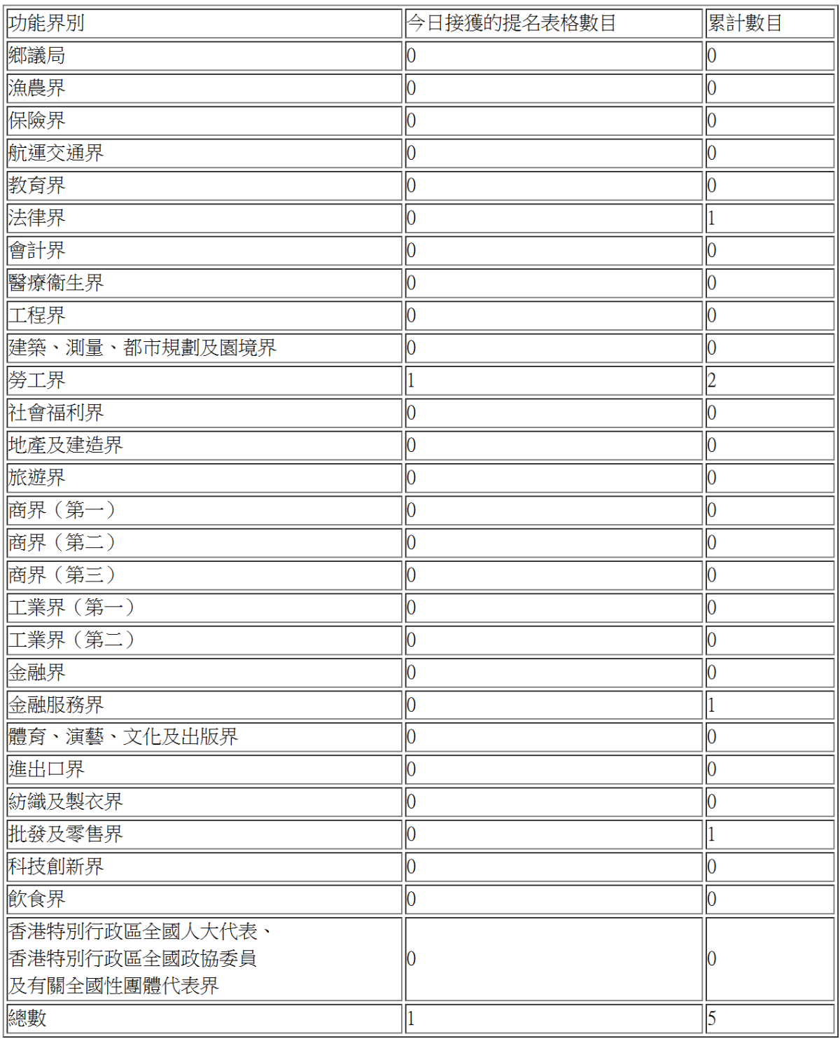 選舉委員會界別今日接獲的提名表格數目為6份,至今累計數目為10份。
