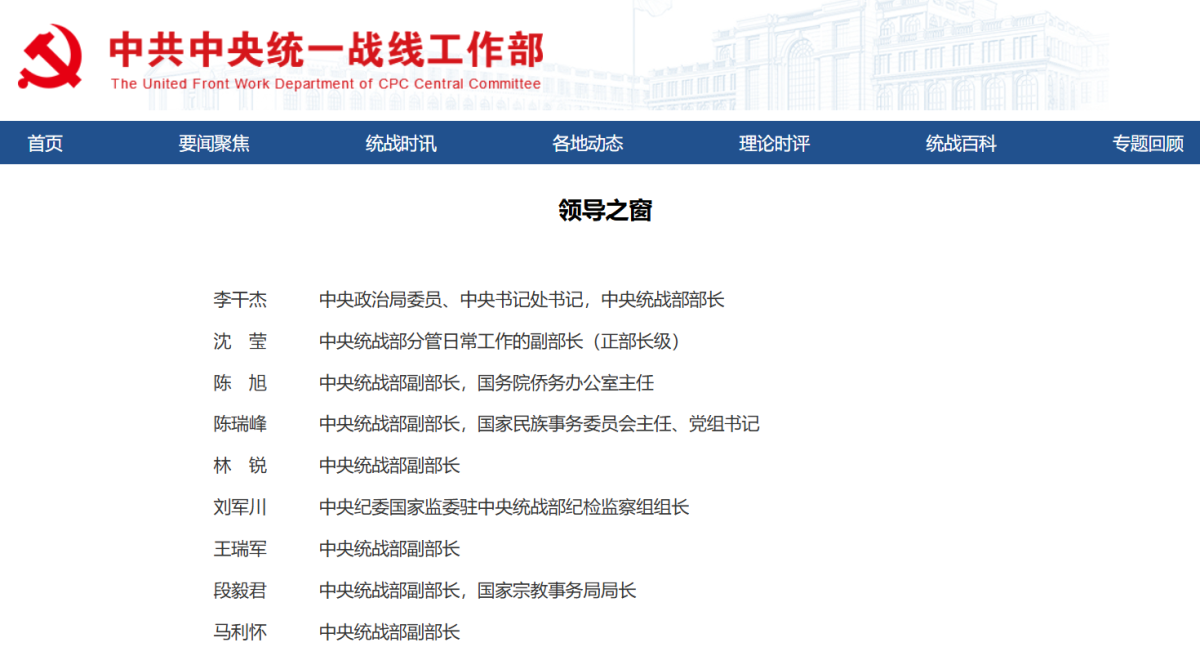 中央統戰部官網顯示,李干傑現任中央政治局委員、中央書記處書記,中央統戰部部長。沈瑩現任中央統戰部分管日常工作的副部長(正部長級);陳旭現任中央統戰部副部長,國務院僑務辦公室主任;陳瑞峰現任中央統戰部副部長,國家民族事務委員會主任、黨組書記;林銳現任中央統戰部副部長;劉軍川現任中央紀委國家監委駐中央統戰部紀檢監察組組長;王瑞軍現任中央統戰部副部長;段毅君現任中央統戰部副部長,國家宗教事務局局長;馬利懷現任中央統戰部副部長。