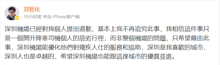 鄭智化昨日深夜再度回應事件時表示,「深圳機場已經對我個人提出道歉,基本上我不再追究此事,我相信這件事只是一個開升降車司機個人的惡劣行徑,而非整個機場的問題,只希望藉由此事,深圳機場能優化他們對殘疾人士的服務和協助,深圳是我喜歡的城市,深圳人也是卓越的,希望深圳機場也能跟這座城市的優質並進。」