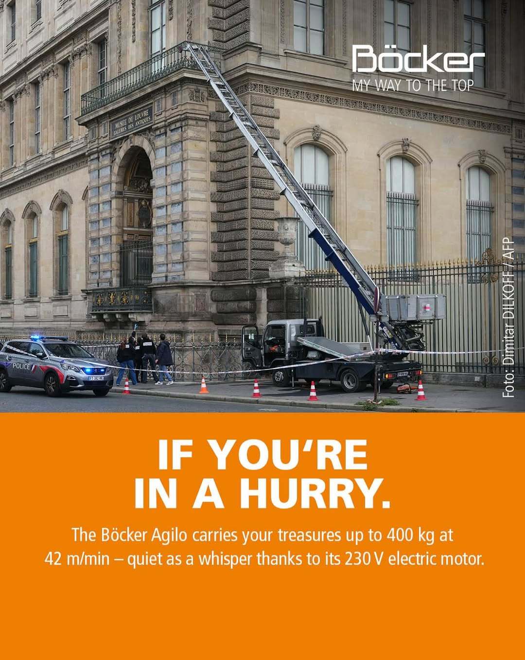 【點新聞報道】法國羅浮宮博物館本月19日上午發生搶劫事件,竊賊駕駛一輛裝有升降裝置的卡車,從二樓陽台進入博物館。德國電梯製造商「Böcker」藉此抽水,在社交媒體發布廣告宣傳自家產品,引起廣泛關注。