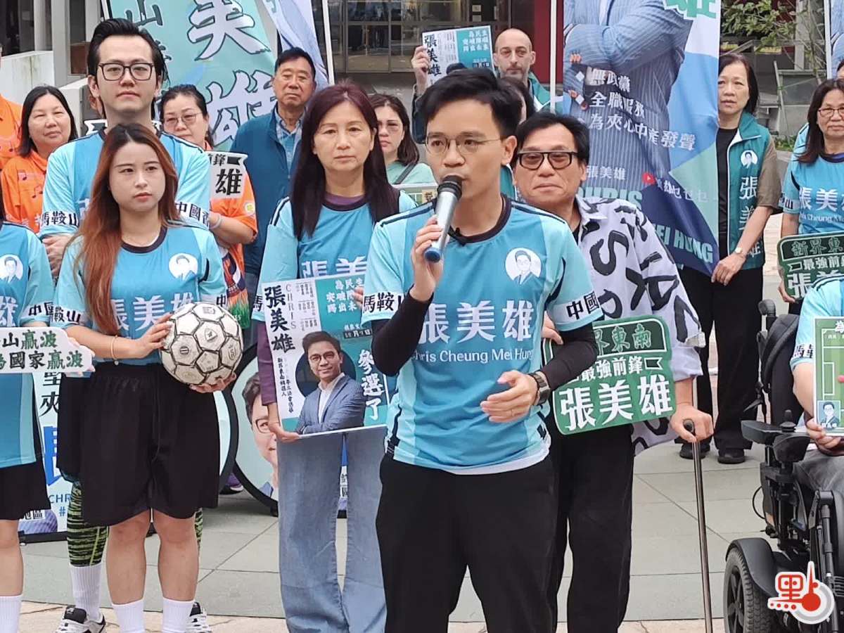 西貢區議員張美雄今早抵達將軍澳政府綜合大樓,報名參選新界東南選區。他表示,期望進入立法會這個更廣闊的「賽場」,協助政府推動民生議題,例如優化家庭友善政策、完善長者照顧體系、支持中年人轉型、助力中小企升級、推行全人教育等。張美雄說,自己會以無黨派身份,與市民並肩,像全速衝刺的足球前鋒,用盡每一分力為民生尋找「入球」機會。
