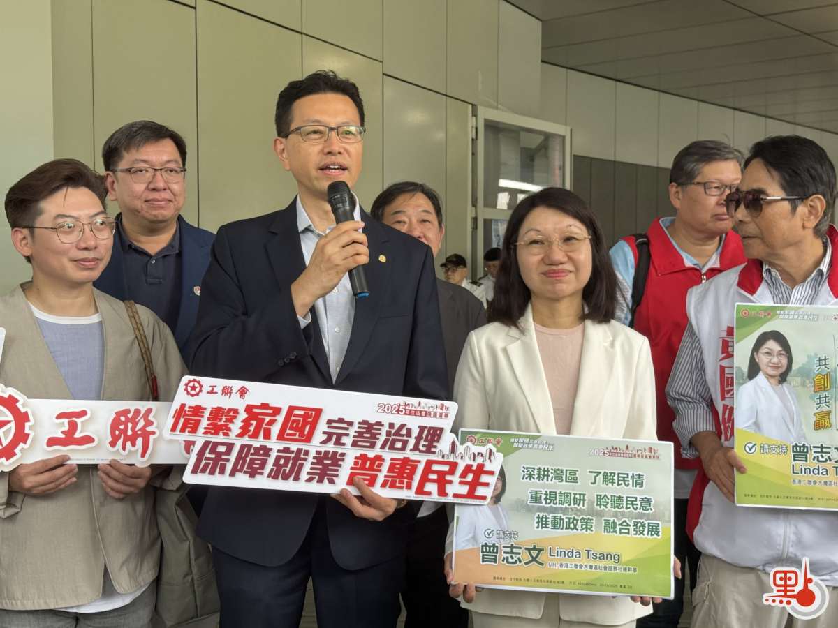 工聯會大灣區社會服務社總幹事曾志文在工聯會會長吳秋北等人的陪伴下,今日在政府總部入口處宣布,報名參選新一屆立法會選舉中的選舉委員會界別。曾志文強調,灣區融合對香港至關重要,她願意作為「橋樑」,藉助立法會平台凝聚更多社會力量,共同推動大灣區融合發展。