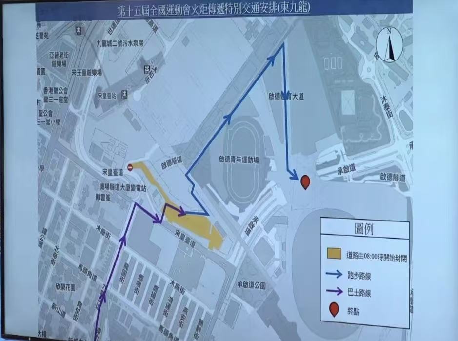 ▷東九龍區:啟德主場館的上落客區將於上午8時起封閉;火炬傳遞巴士路段將經東九龍走廊、九龍城道及宋皇臺道進入啟德體育園,因此這些路段亦會間接性封閉。