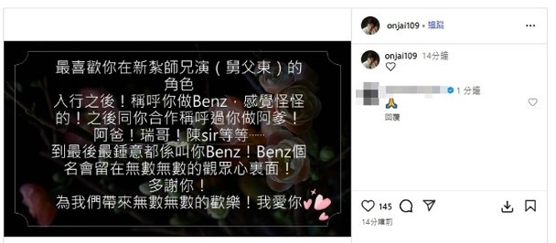 郭晉安亦在社交平台留言:「最喜歡你在《新紮師兄》演『舅父冬』的角色,入行之後稱呼你做Benz,感覺怪怪的!之後同你合作稱呼過你做阿爹、阿爸、瑞哥、陳Sir等……到最後最鍾意都係叫你Benz!Benz個名會留在無數無數觀眾心裏面!多謝你!為我們帶來無數無數的歡樂!我愛你!」