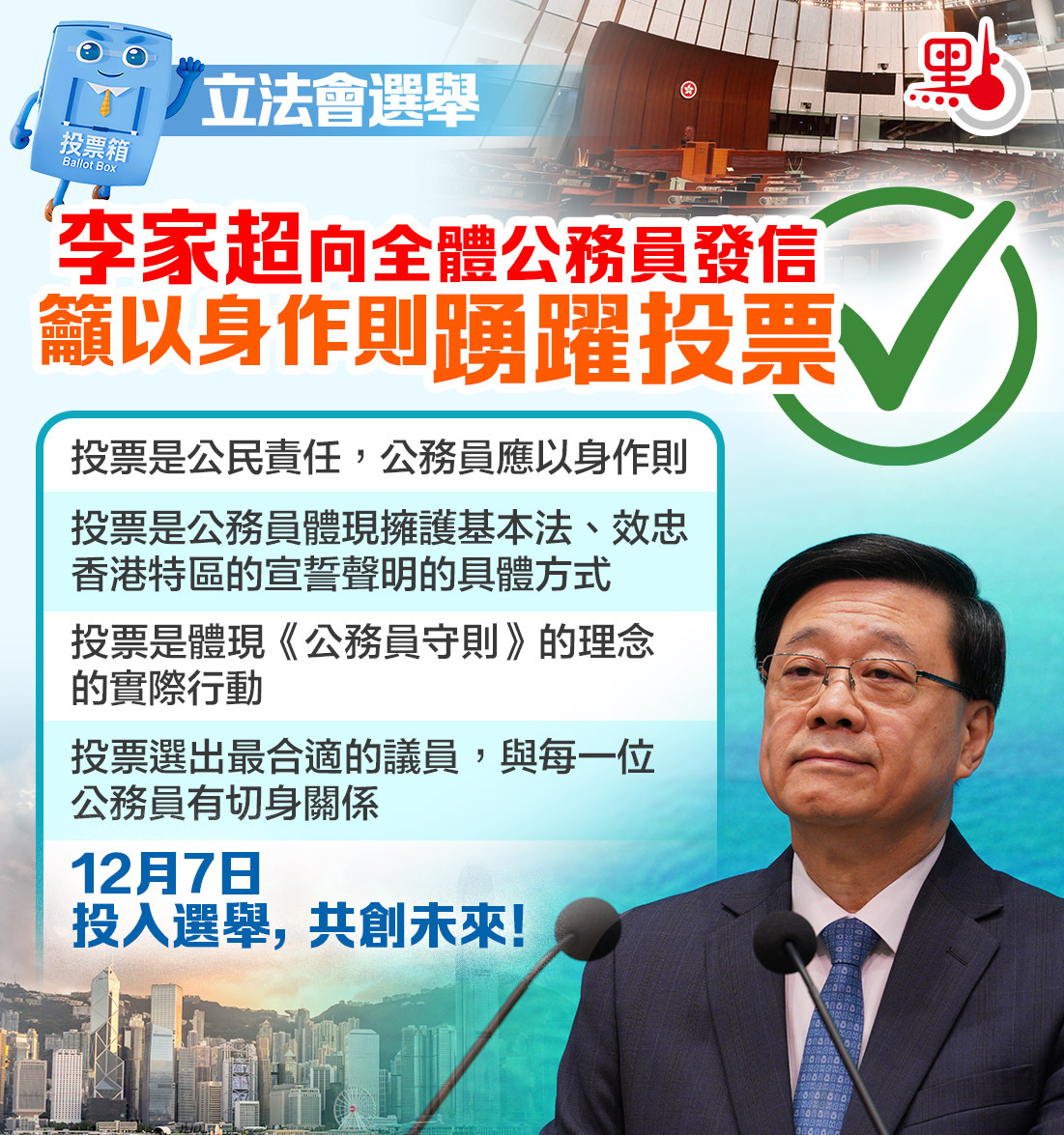 李家超指出,投票是公民責任,公務員應以身作則。基本法第26條訂明:「香港特別行政區永久性居民依法享有選舉權和被選舉權。」投票不僅是包括公務員在內全體香港市民的權利,更是應有之義。公務員作為政府團隊一員,更應以身作則,以投票履行公民責任。