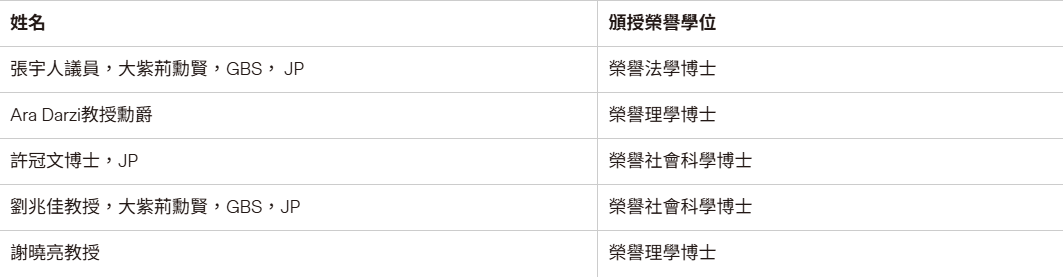 【點新聞報道】香港中文大學(中大)將於今年12月11日(星期四)舉行第96屆大會榮譽博士頒授學位典禮,頒授榮譽博士學位予五位傑出人士,其中張宇人將獲頒榮譽法學博士,Ara Darzi、謝曉亮將獲頒榮譽理學博士,許冠文、劉兆佳將獲頒榮譽社會科學博士,以表彰他們在公共政策、醫療創新、科學研究及藝術等多個領域的卓越成就。