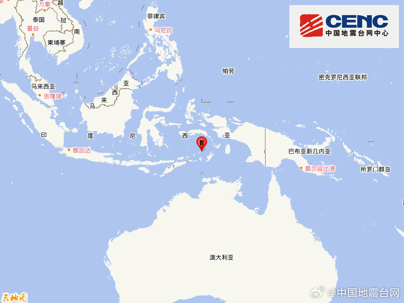 中國地震台網正式測定,北京時間10月28日22時40分在印尼班達海(南緯6.65度,東經130.05度)發生6.4級地震,震源深度150千米。