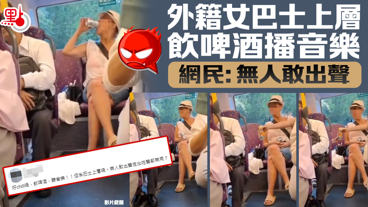 【點新聞報道】巴士車廂內嚴禁飲食,但近日網上流傳一段影片,拍到一名外籍女子在巴士上層坐位,手持啤酒邊飲、邊播音樂,且音量頗高,引起其他乘客側目。