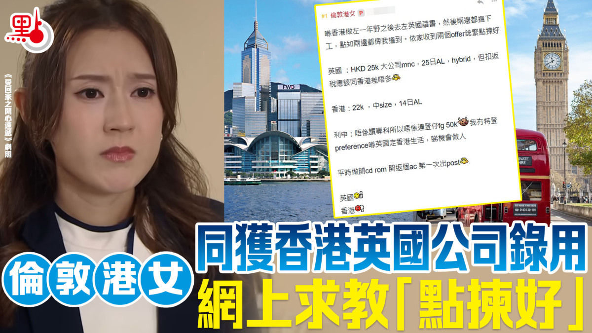 【點新聞報道】英國的職場與香港各有不同,一名在英國的港女在網上發文,表示近日在香港和英國同時找到工作,分別收到兩地公司的錄取通知,以及薪酬福利方案,直言自己仍心大心細,遂問網民「緊點揀好」。