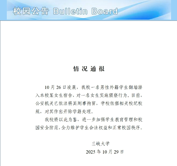【點新聞報道】10月29日,三峽大學發布情況通報指,10月26日凌晨,三峽大學一名男性外籍學生翻牆潛入本校某女生宿舍,對一名女生實施猥褻行為。目前,公安機關已依法將其刑事拘留,學校依據相關校紀校規,對其作出開除學籍處理。