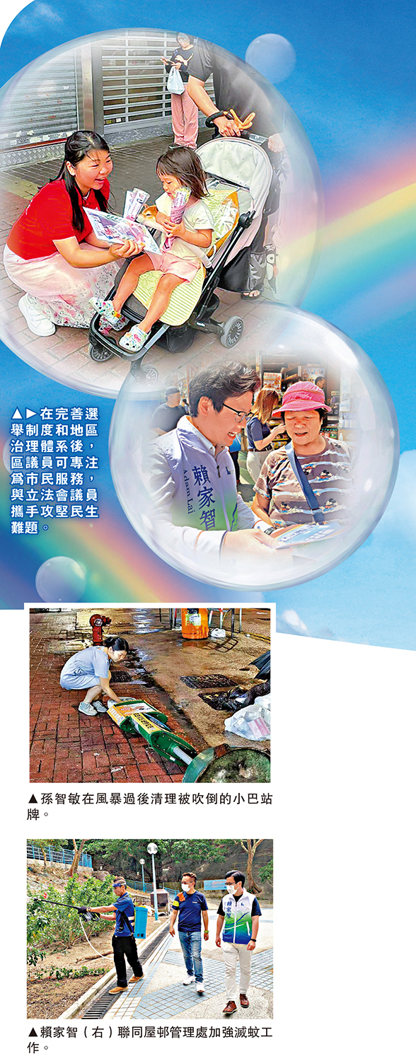 「以前區議會吵吵鬧鬧玩表演,現在是實實在在做事!」在完善選舉制度和地區治理體系後,區議會終結「泛政治化」亂象,重回服務市民的正軌。有區議員接受《大公報》訪問時表示,區議員與立法會議員攜手攻堅民生難題,從油尖旺老舊樓宇維修到南港島綫西段推進,處處可見「民生直通車」的成效。有區議員指出,街坊社區瑣事,對他們而言都是頭等大事。街坊們表示,新選制實施後,社區民生問題得到重視,生活質素大大提升。