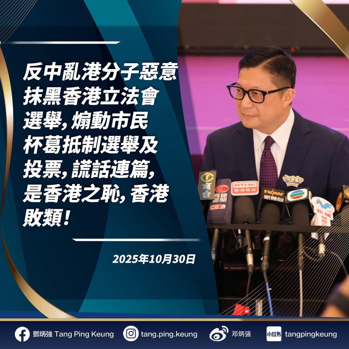 鄧炳強表示,立法會選舉是香港人的重要大事,12月7日,請大家踴躍投票,選出真正愛國愛港、有能力、有承擔的立法會議員,共同守護香港的繁榮穩定!