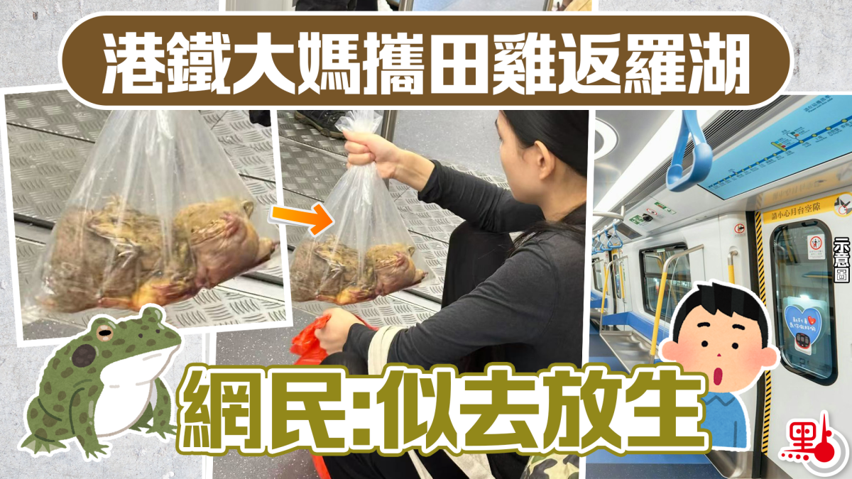 樓主於Threads上傳一張照片,顯示有大媽蹲坐在港鐵車廂地面,手持一個透明膠袋,袋中有4隻田雞。樓主補充稱,他目擊大媽「同我一齊喺羅湖落車」,故猜測對方是將田雞運送至內地。