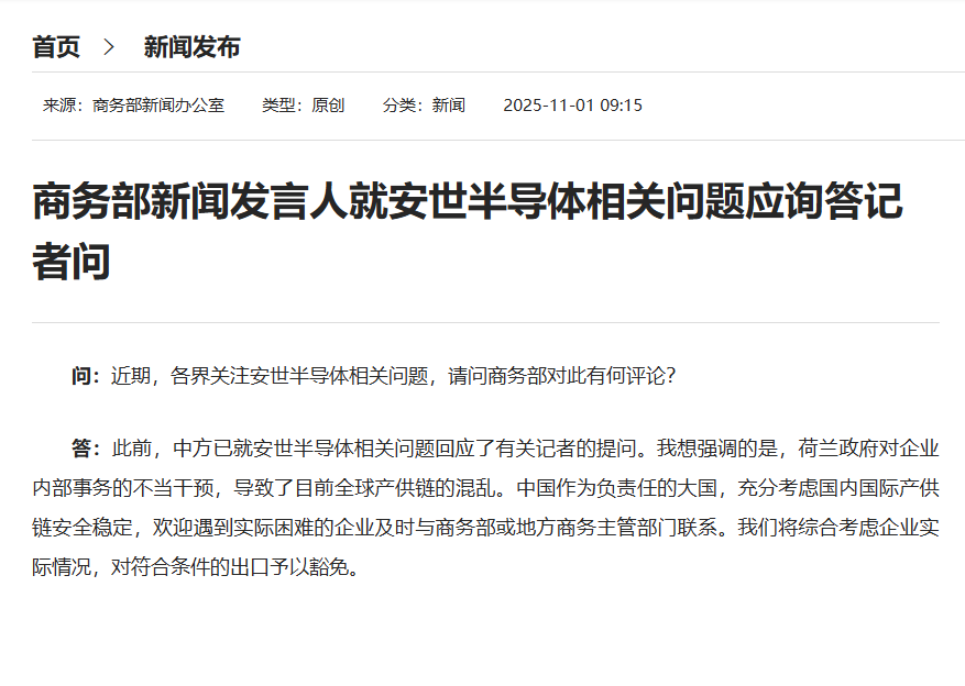 【點新聞報道】近日,聞泰科技在荷蘭的分支機構安世半導體(Nexperia)受到當地政府的干預,引發產業界高度關注。商務部新聞發言人今日(11月1日)就安世半導體相關問題應詢答記者問時表示,荷蘭政府對企業內部事務的不當干預,導致了目前全球產供鏈的混亂。中國作為負責任的大國,充分考慮國內國際產供鏈安全穩定,歡迎遇到實際困難的企業及時與商務部或地方商務主管部門聯繫。中方將綜合考慮企業實際情況,對符合條件的出口予以豁免。