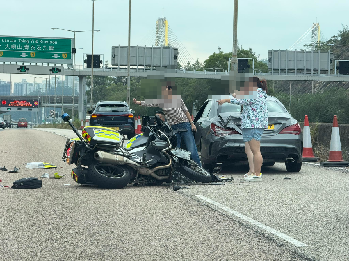 【點新聞報道】今日(11月1日)早上10時26分,青朗公路近大欖隧道九龍出口發生交通意外。一部私家車與警察電單車相撞,從網絡圖片所見,私家車車尾撞凹,警察電單車橫臥路上,車頭損毀,零件散滿一地,交通警倒在地上,身旁圍有數名市民,狀甚緊張。