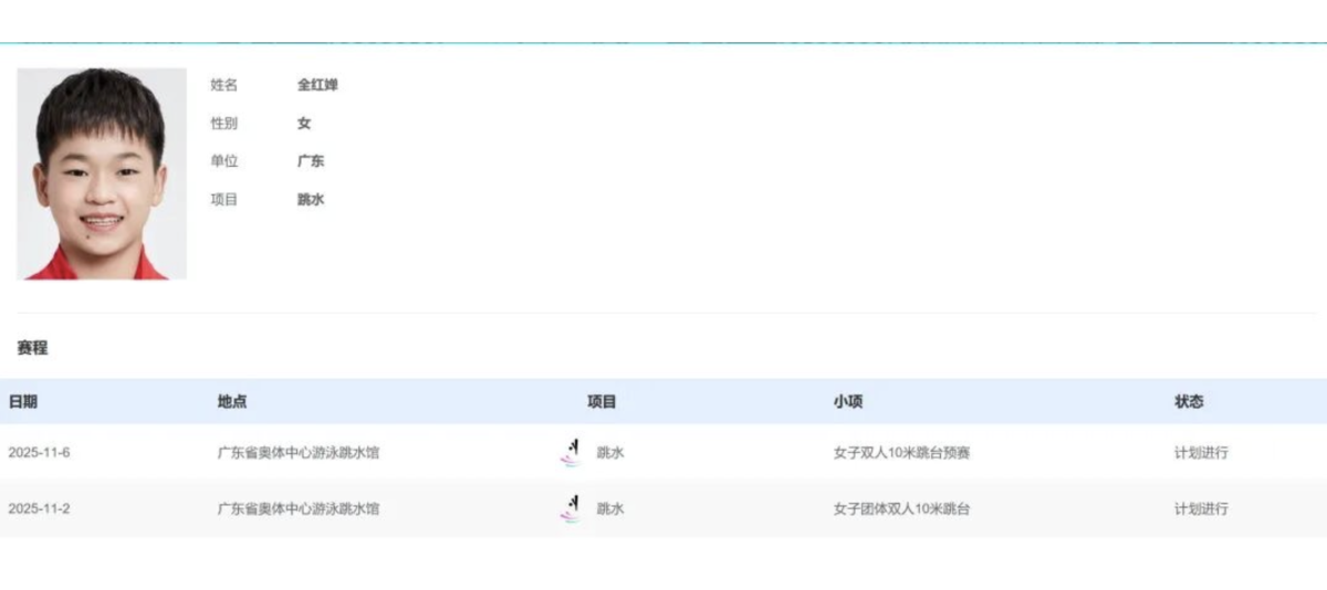 此前十五運會官網顯示,全紅嬋將出現在女子團體雙人10米跳台、女子雙人10米跳台、女子10米跳台3個項目中。1日,根據官網顯示的最新消息,全紅嬋僅出現在女子團體雙人10米跳台項目和女子雙人10米跳台項目名單中。