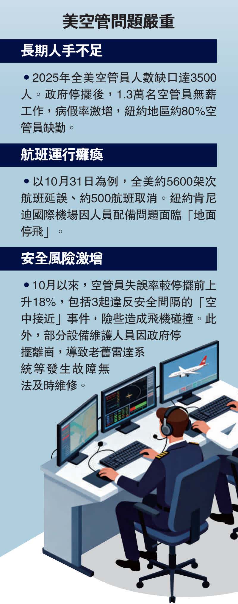 美國長期面臨空管員短缺的難題。根據FAA數據,2025年全美空管員人數比目標配置短缺約3500人。在本次政府停擺前,許多空管員就已被迫每周工作6天或強制加班。