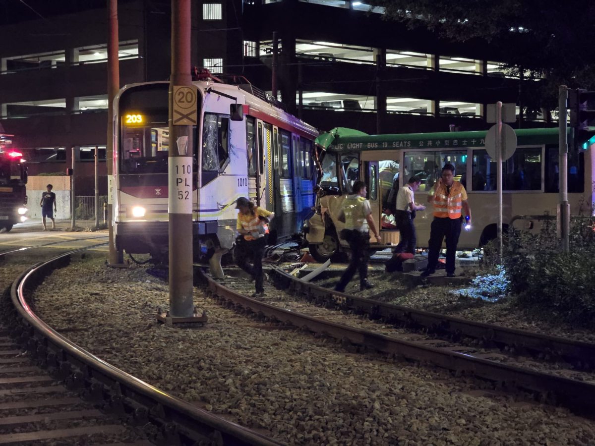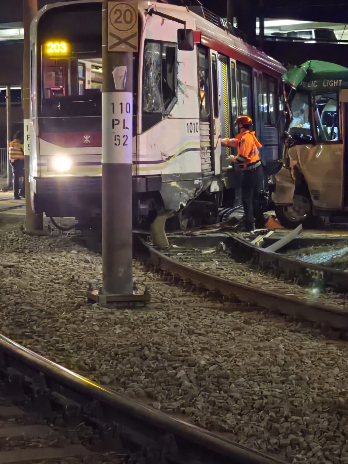警方表示,今日(2日)凌晨0時48分,一輛輕鐵列車沿青麟路往屯門方向行駛,另一輛小巴沿青麟路往落馬洲方向行駛,當駛至青麟路時,小巴懷疑撞向輕鐵列車。消防接報到場,64歲馮姓小巴男司機腳部受傷被困,由消防救出,34歲何姓車長頭部受傷,兩車6男4女乘客受輕傷,年齡介乎16歲至66歲,12名傷者清醒被送往屯門醫院治理。