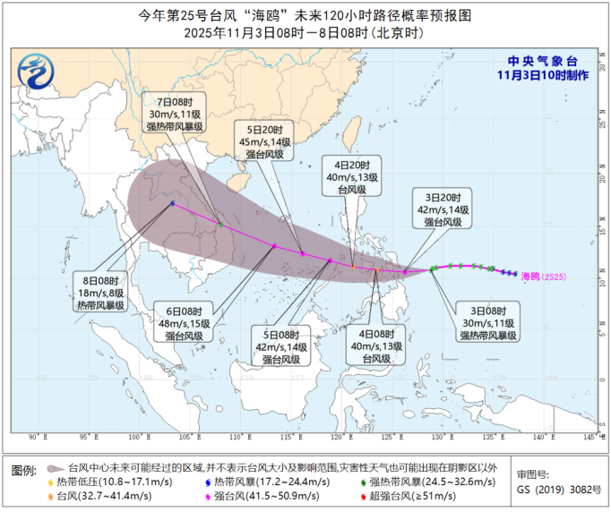 【點新聞報道】據中央氣象台消息,今年第25號颱風「海鷗」(強熱帶風暴級)的中心今天(11月3日)上午8時位於菲律賓馬尼拉東偏南方向大約950公里的西北太平洋洋面上,即北緯10.8度、東經128.8度,中心附近最大風力有11級(30米/秒),中心最低氣壓為980百帕,七級風圈半徑200至320公里,十級風圈半徑100至140公里。