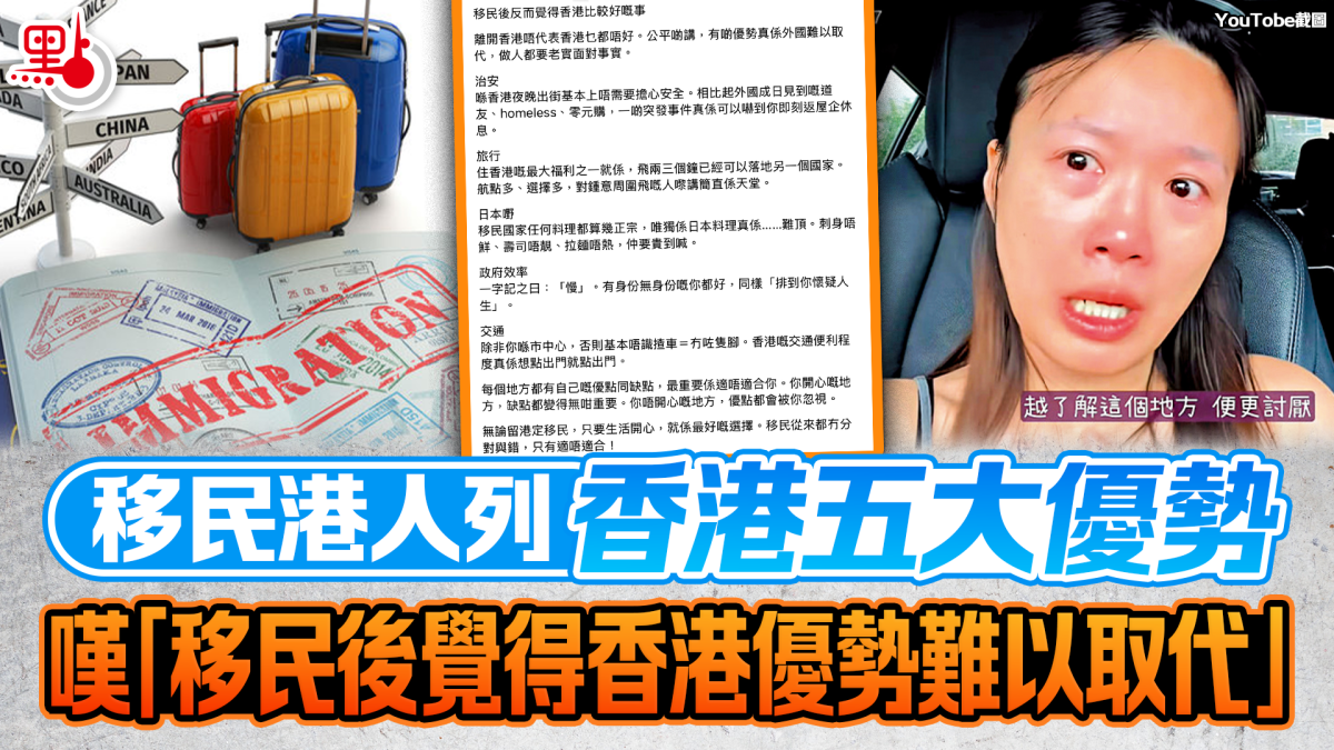 【點新聞報道】不少港人以為去到國外就一定可以享受到美好生活,之但係事實並非如此,例如國外的治安、食物、交通、效率......,其實未必好過香港。近日有移民外國的港人以「移民後反而覺得香港比較好」為題發文,列舉香港五大優勢,掀起網上熱議。