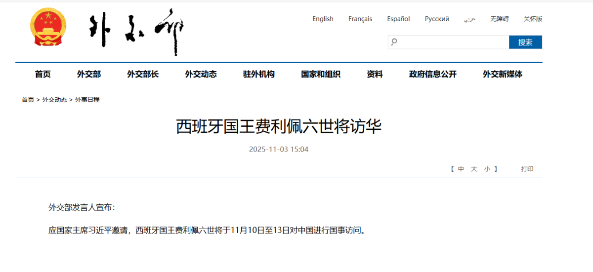 【點新聞報道】據外交部網站11月3日公告,外交部發言人宣布,應國家主席習近平邀請,西班牙國王費利佩六世將於11月10日至13日對中國進行國事訪問。