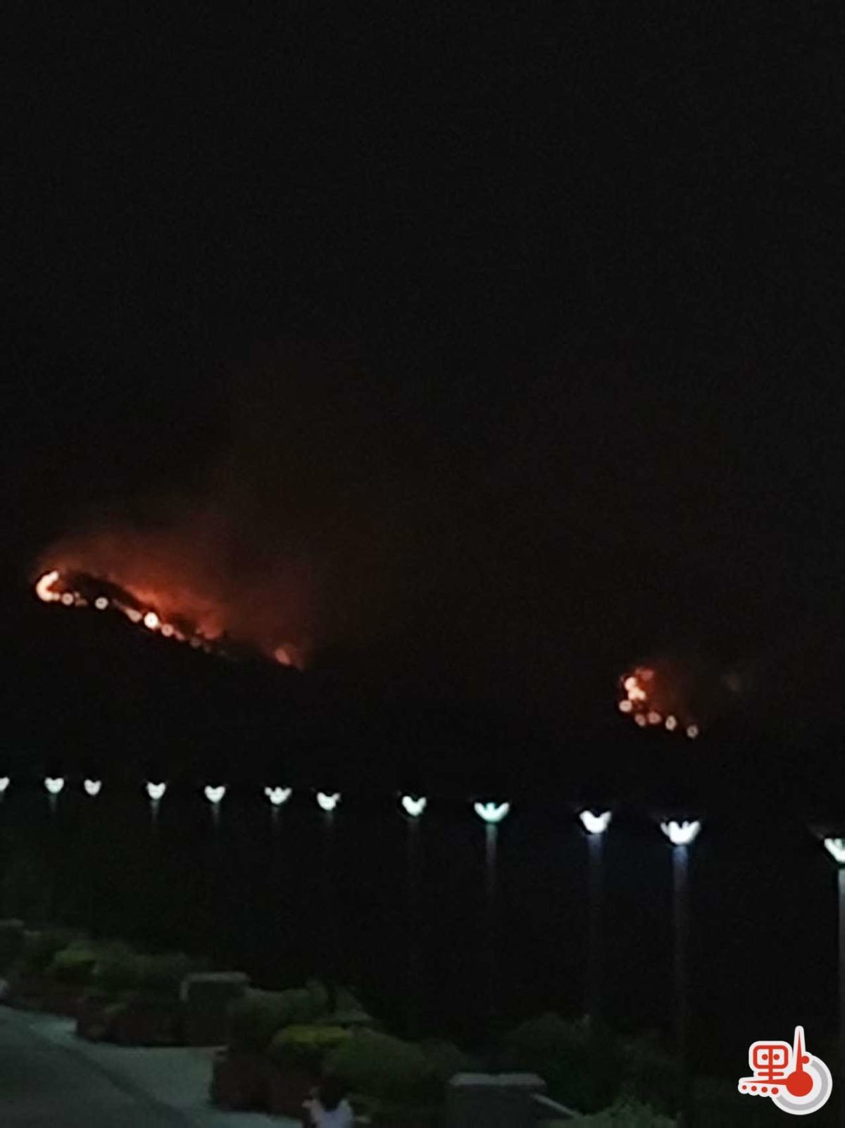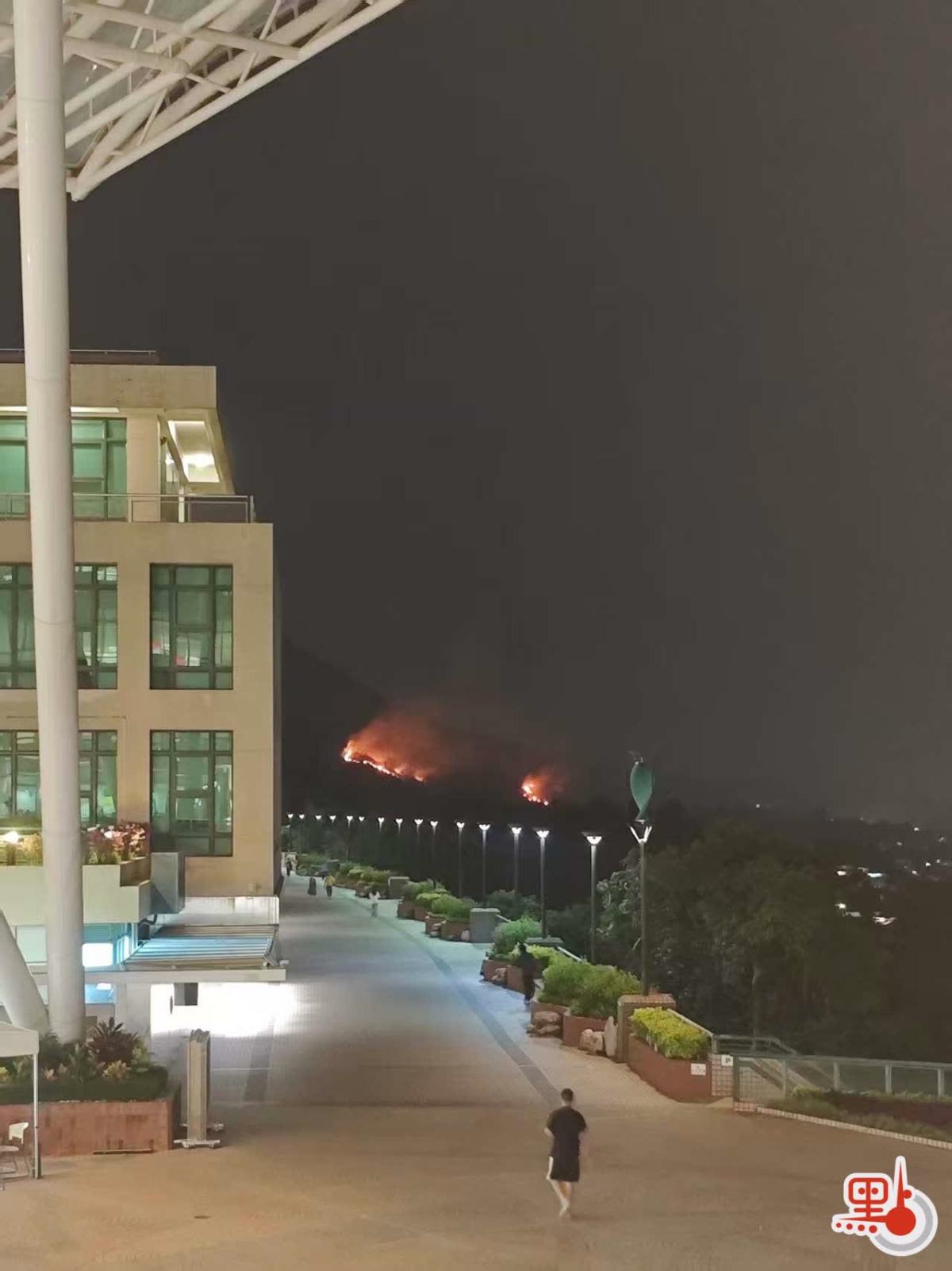 晚上約9時半,山火仍在焚燒。點新聞記者拍到長長「火龍」俯臥山頭,兩條約20米火線清晰可見。至10時,火勢照亮夜空,有讀者反映山火有增強趨勢。