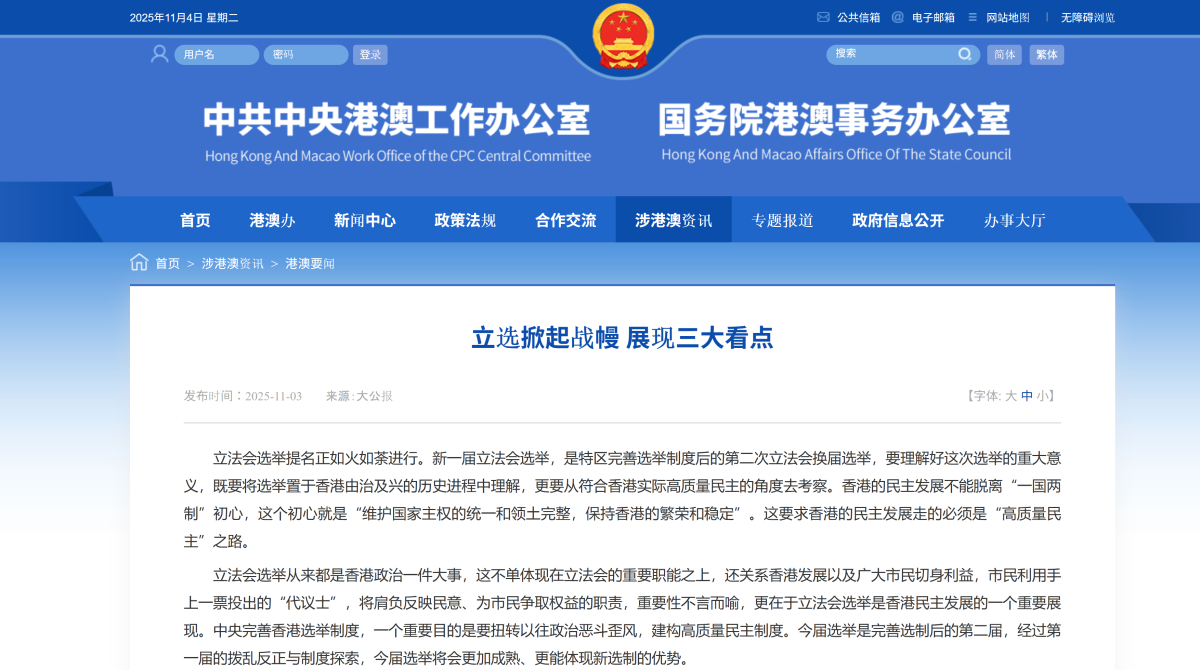 【點新聞報道】中央港澳工作辦公室、國務院港澳事務辦公室,11月3日在網站轉載《大公報》題為《立選掀起戰幔 展現三大看點》的時評。文章強調,本次立法會選舉展現香港民主發展,不能脫離「一國兩制」初心,關乎香港發展以及廣大市民切身利益,今屆選舉將呈現競爭更加激烈、參選人更加多元、不確定性更高等特點,中央亦對新一屆立法會議員提出「四組更加」的期望,本次選舉將是真正「優中選優」,選民的一票將發揮關鍵作用。以下為全文: