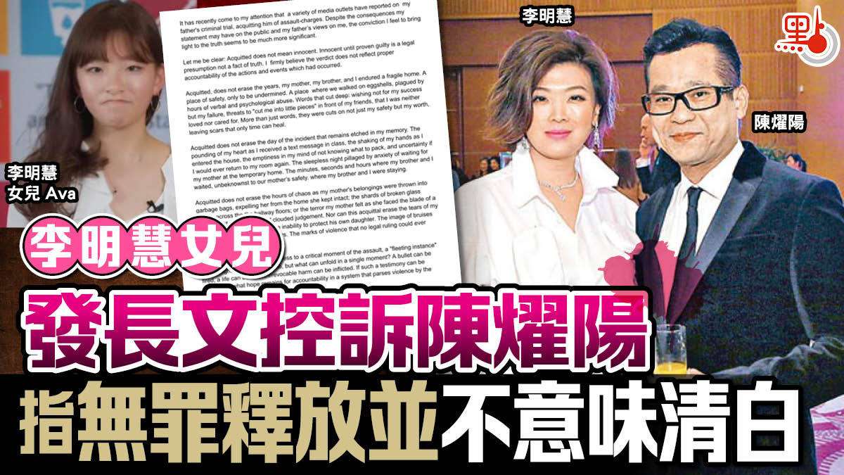 李明慧的女兒Ava日前在社交平台發出千字長文,揚言要揭露真相,稱無罪釋放並不意味清白。Ava稱,無罪推定是一種法律原則,而非事實,而判決結果沒有反應出實際發生的行為及事件的責任。