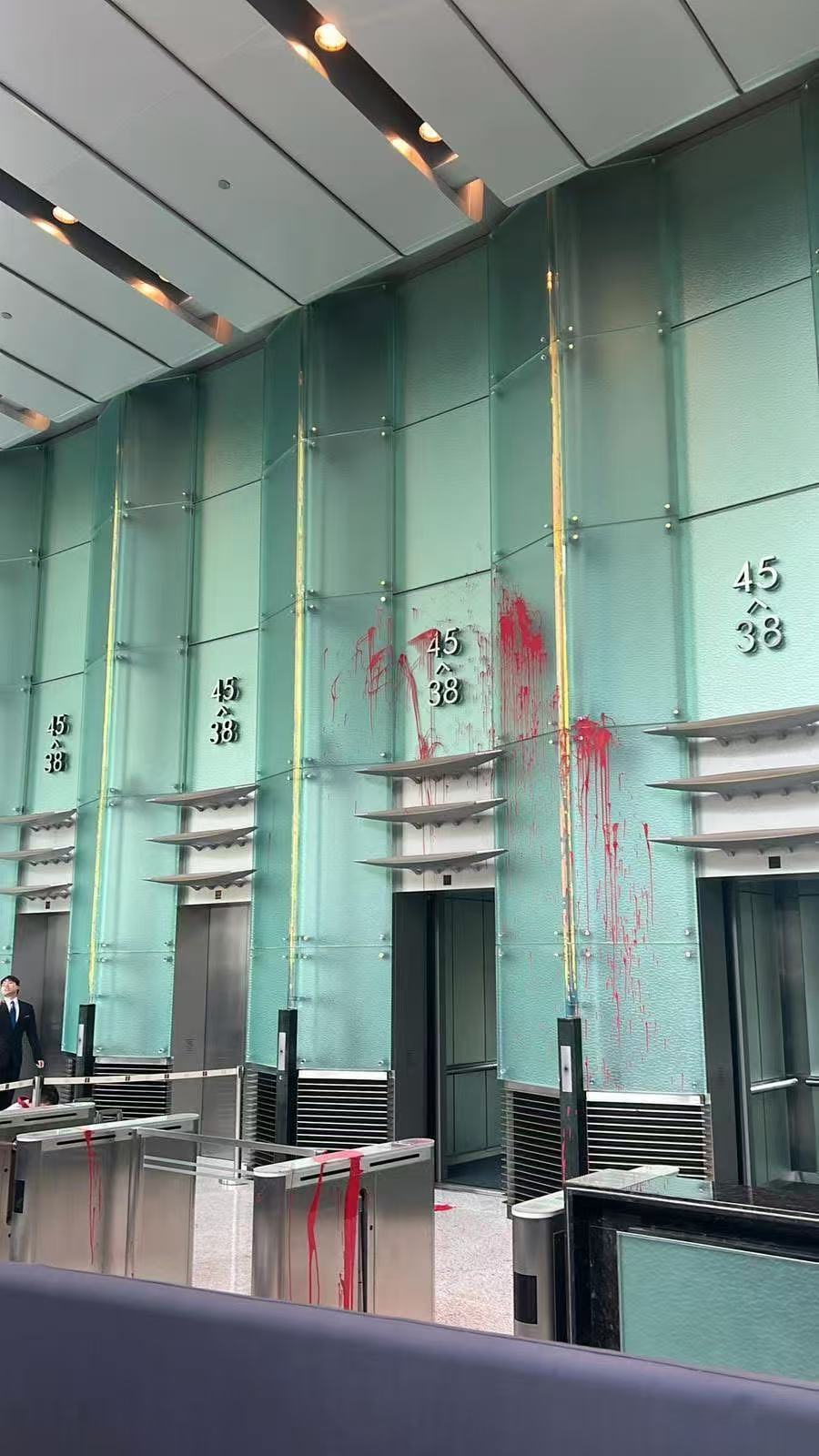 現場是通往花園道的電梯大堂,地面多處被淋紅油,一部升降機的門和玻璃飾面亦染紅,職員忙於清理。