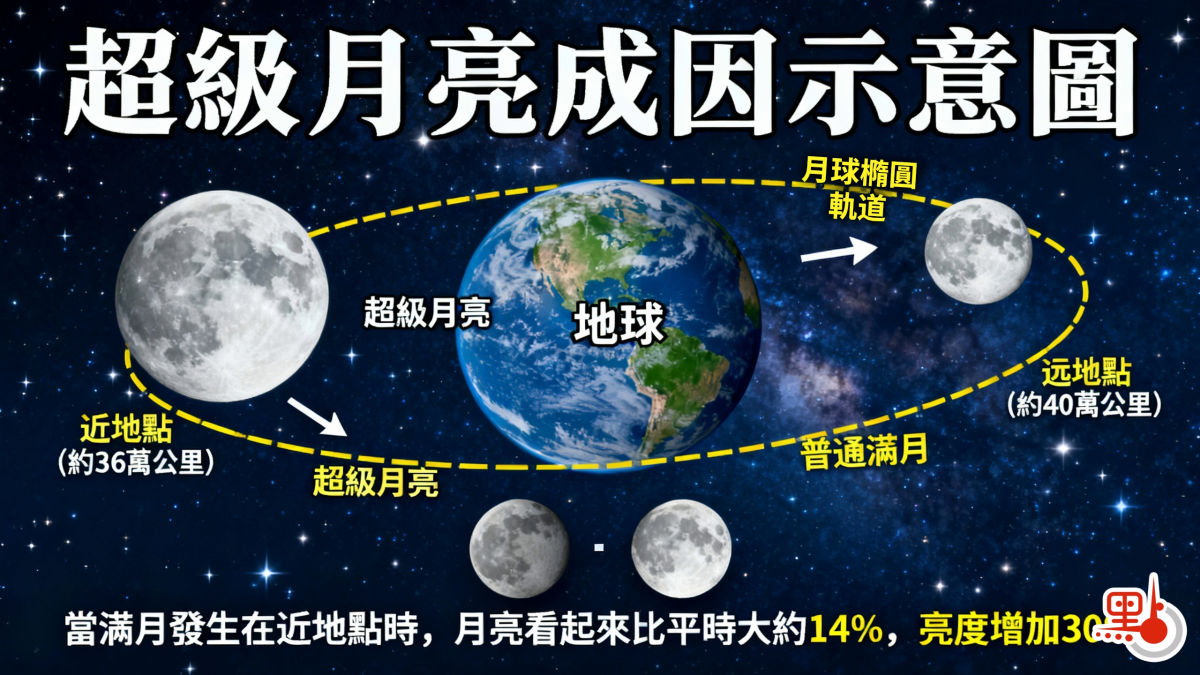 「超級月亮」在天文學上稱為「近地點滿月」。月球繞地球運行的軌道並非正圓,而是橢圓形。當月球運行到距離地球最近的「近地點」時,恰好遇上滿月,就會形成我們所說的「超級月亮」。