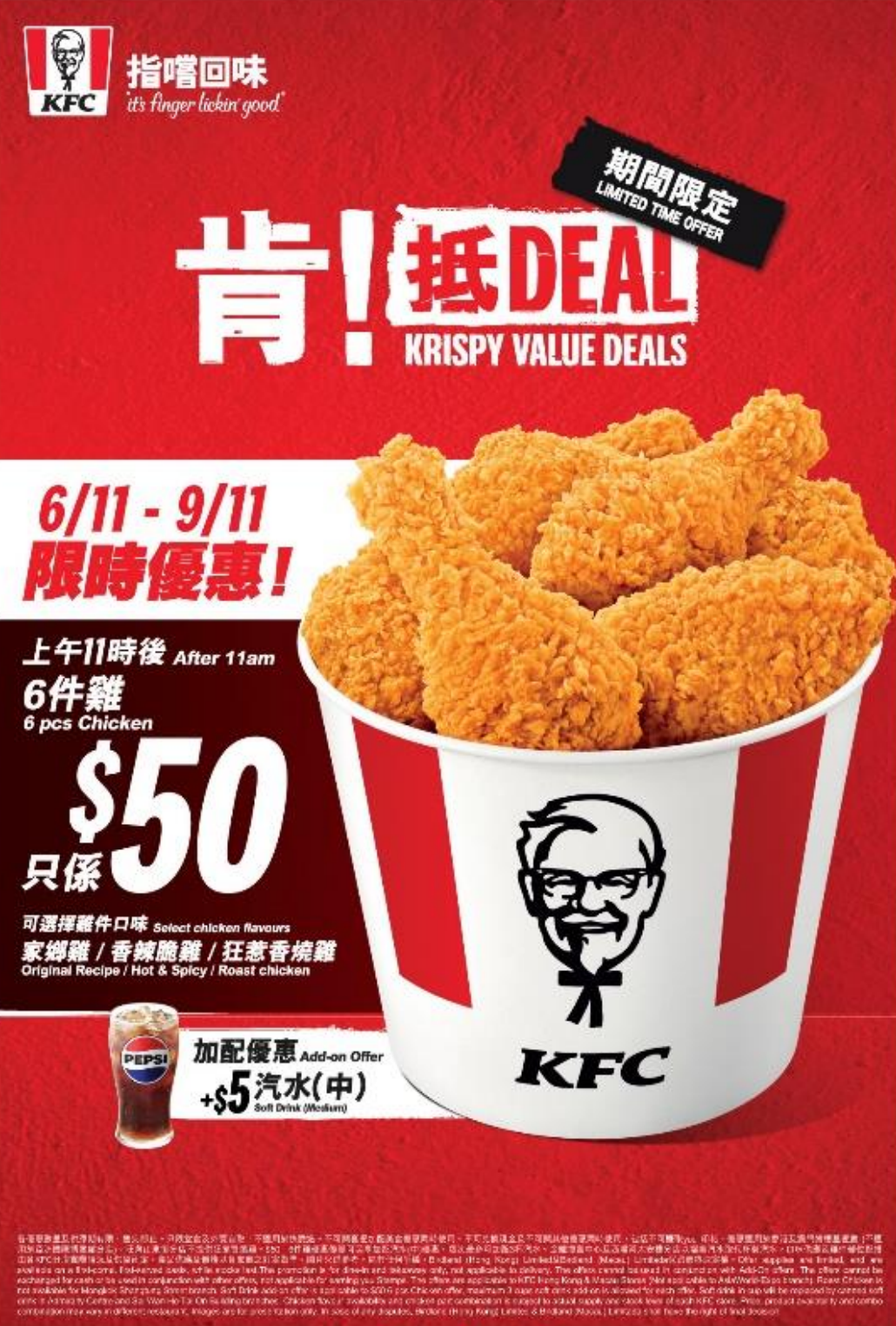 「$50六件雞」優惠提供家鄉雞、香辣脆雞、狂惹香燒雞共3款KFC經典大熱款任君選擇,食客亦可加5元享優惠價汽水。
