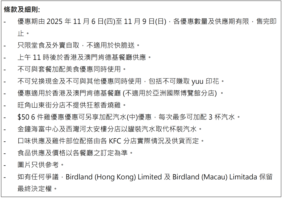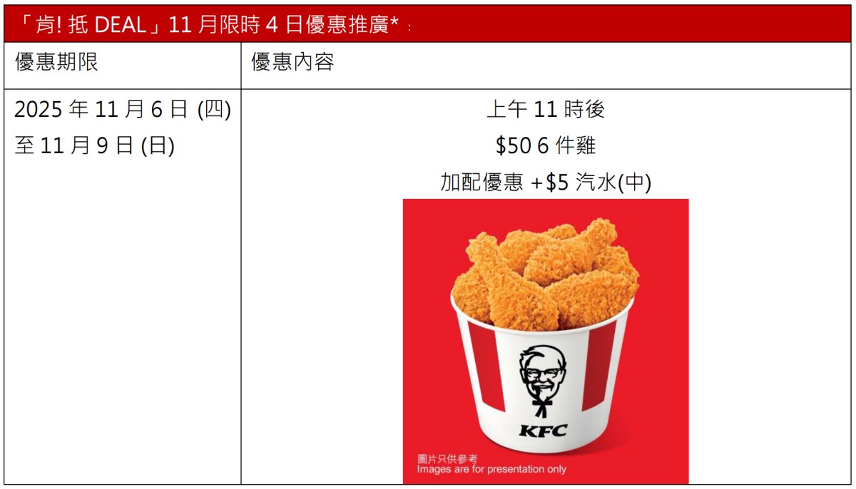 【點新聞報道】喜愛肯德基炸雞的食客請注意!肯德基宣布將於2025年11月6日(周四)起至11月9日(周日),一連4日推出「肯!抵DEAL」限時優惠活動,主打「$50六件雞」超值組合,讓食客以實惠價格購買多款口味炸雞。