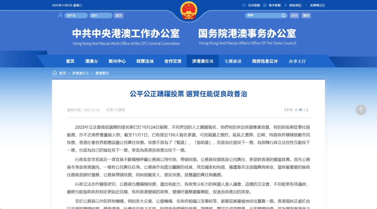 【點新聞報道】中央港澳工作辦公室、國務院港澳事務辦公室,11月4日在網站轉載《文匯報》題為《公平公正踴躍投票 選賢任能促良政善治》的時評。文章強調,新一屆立法會選舉提名期,各行各業的人士都積極參選,是絕佳機會選出專業的人為社會解決專業的問題,香港社會各界應盡公民責任投票。本次立法會選舉投票,是為社區投下一票、為保障行政立法良性互動投下一票,也是為自己的福祉投下一票,更是為香港良政善治投下一票。以下為全文: