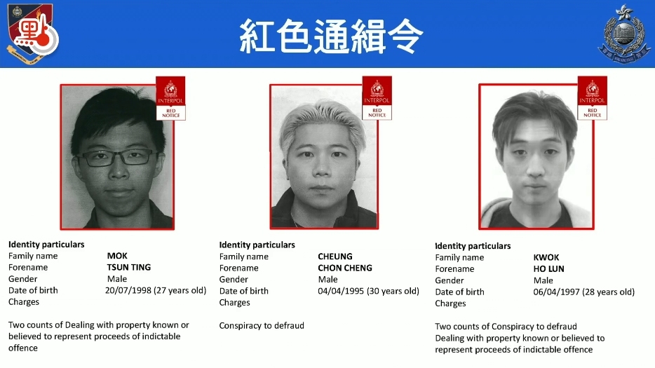 由於部分涉案人士在警方採取拘捕行動前已潛逃海外,警方亦透過國際刑警組織發出紅色通緝令,追捕2名在逃集團主腦及1名骨幹成員。警方亦會繼續與國際刑警及海外執法機構保持緊密合作,全力緝捕在逃人士。