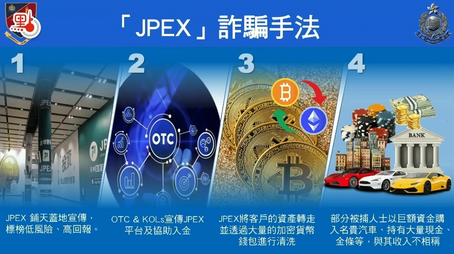證監會於2023年點名警告加密貨幣交易平台JPEX,指其從未向證監會申請牌照,與宣傳不符,提供虛假陳述,又列出多個疑點,有投資者發現戶口錢包的資產被轉走。警方其後以涉嫌串詐騙拘捕林作及陳怡等多人,同時亦搜查多間場外找換店(OTC)。另外,其中3名被捕人亦與「幣少爺」黃鉦傑有關,包括幣少助手莫浚廷、BeatBox歌手dR.X黃浩邦及幣圈名人朱公子。