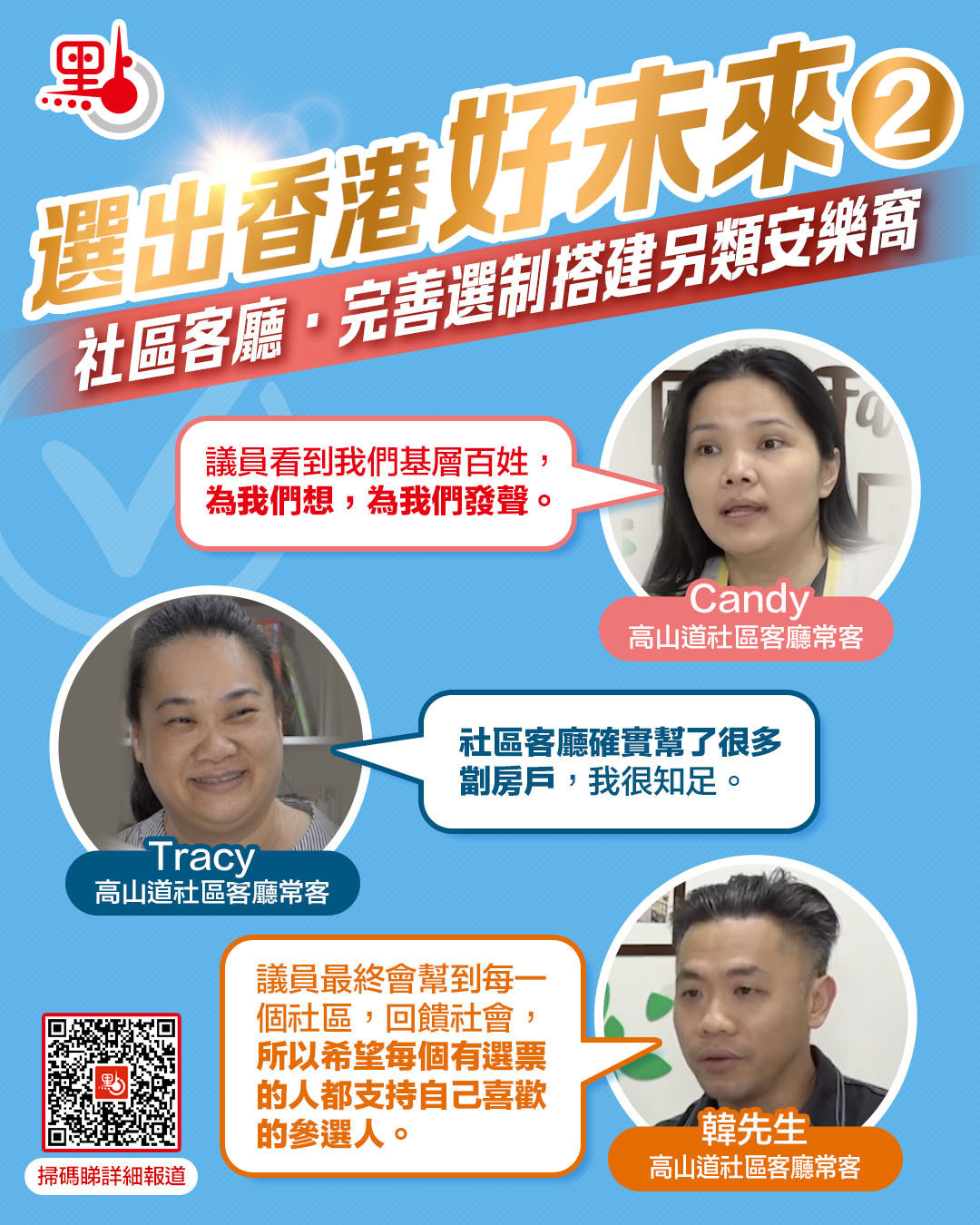 談及心目中理想的立法會議員,大家暢所欲言,Candy認為要立法會議員要「心繫民生」,為民所想,了解百姓所需,為百姓發聲。韓先生則指議員要能真真正正走入社區,了解社區薄弱的地方,接觸當區的居民,從而改善社區。