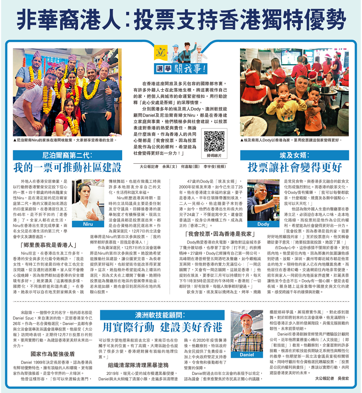 分別居港多年的埃及商人Dody、澳洲軟技能顧問Daniel及尼泊爾裔婦女Niru,都是在香港建立家庭與事業,他們積極參與社會建設,以投票表達對香港的熱愛與責任。無論是什麼族裔,作為香港人的共同心聲都是「我會投票,因為投票是我作為公民的權利,希望能為社會變得更好出一分力!」