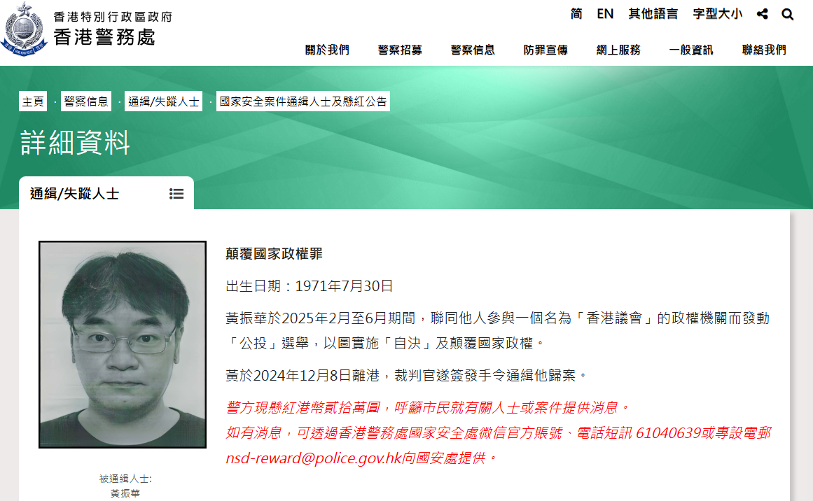 【點新聞報道】保安局局長今年8月行使《維護國家安全條例》賦予的權力,刊憲指明16名因涉嫌在特區境外干犯危害國家安全罪行而被法院發出拘捕令的人,並指明針對這些潛逃者施行的措施。據了解,其中一名指明潛逃者黃振華的母親袁潤蓮,今日(6日)早上被國安處人員帶返旺角警署協助調查。