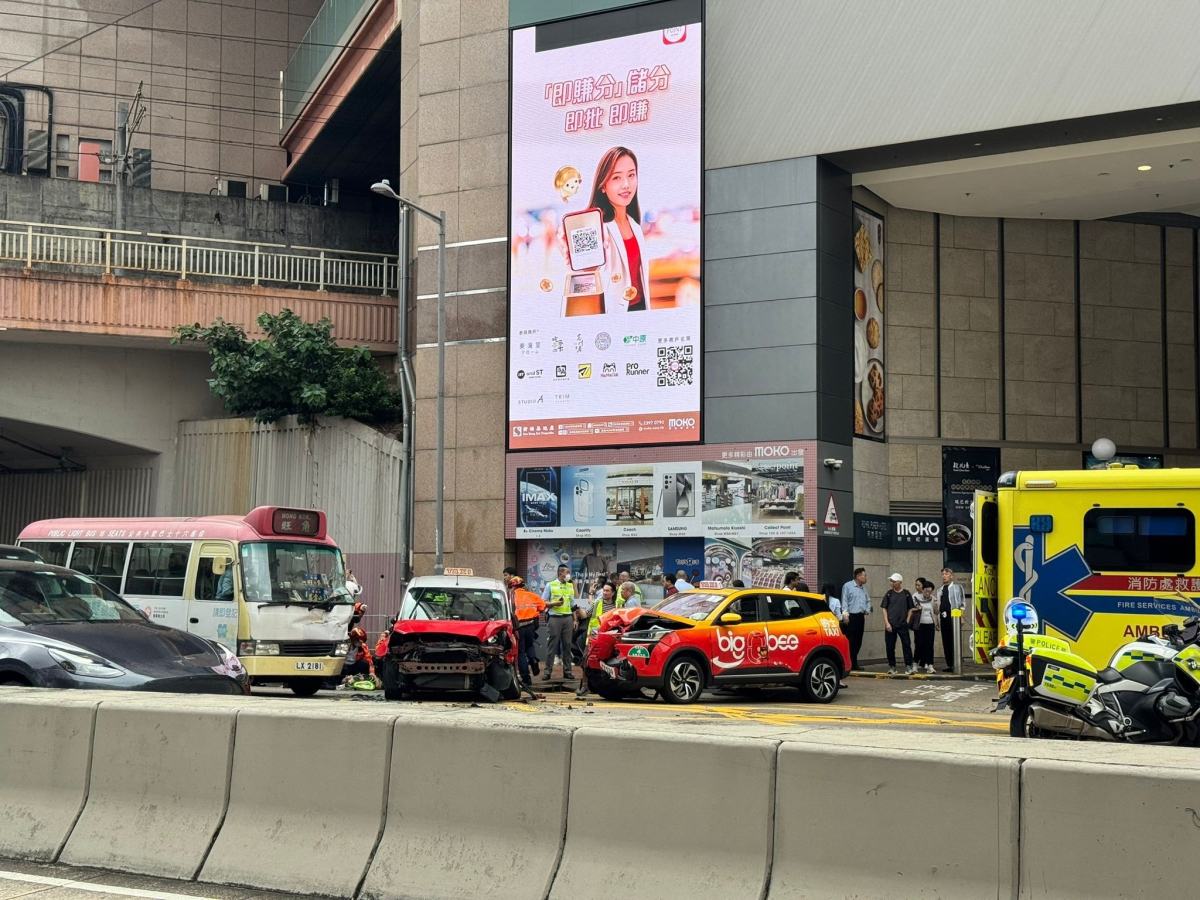 【點新聞報道】今日(6日)上午10時27分,旺角太子道西新世紀廣場(MOKO)的車輛出入口處發生交通意外,涉及兩部的士及一部紅頂小巴,現場有保安員、的士司機及最少3名小巴乘客受傷。