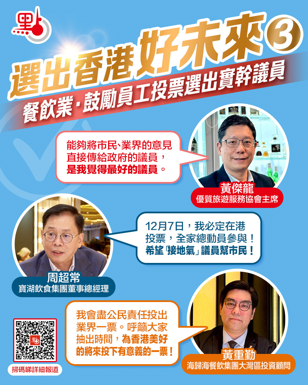 「我已通知公司所有同事,合資格就登記做選民,已經是選民的同事12月7日一定要去投票。」海歸海餐飲集團大灣區投資顧問黃重勤亦號召投票,過去亦幫助同事用「智方便」手機程式登記成為選民。黃重勤讚現時選民登記很方便,選舉日時間亦充足,由早到晚方便任何工種的人士找時間投票。「這選舉不只是選出各區、各界別代表,更是選出能帶領香港穩步向前、真正為市民解決問題的議員。」黃重勤說,他會盡公民責任投出一票,呼籲大家抽出時間,為香港美好的未來投下有意義的一票!