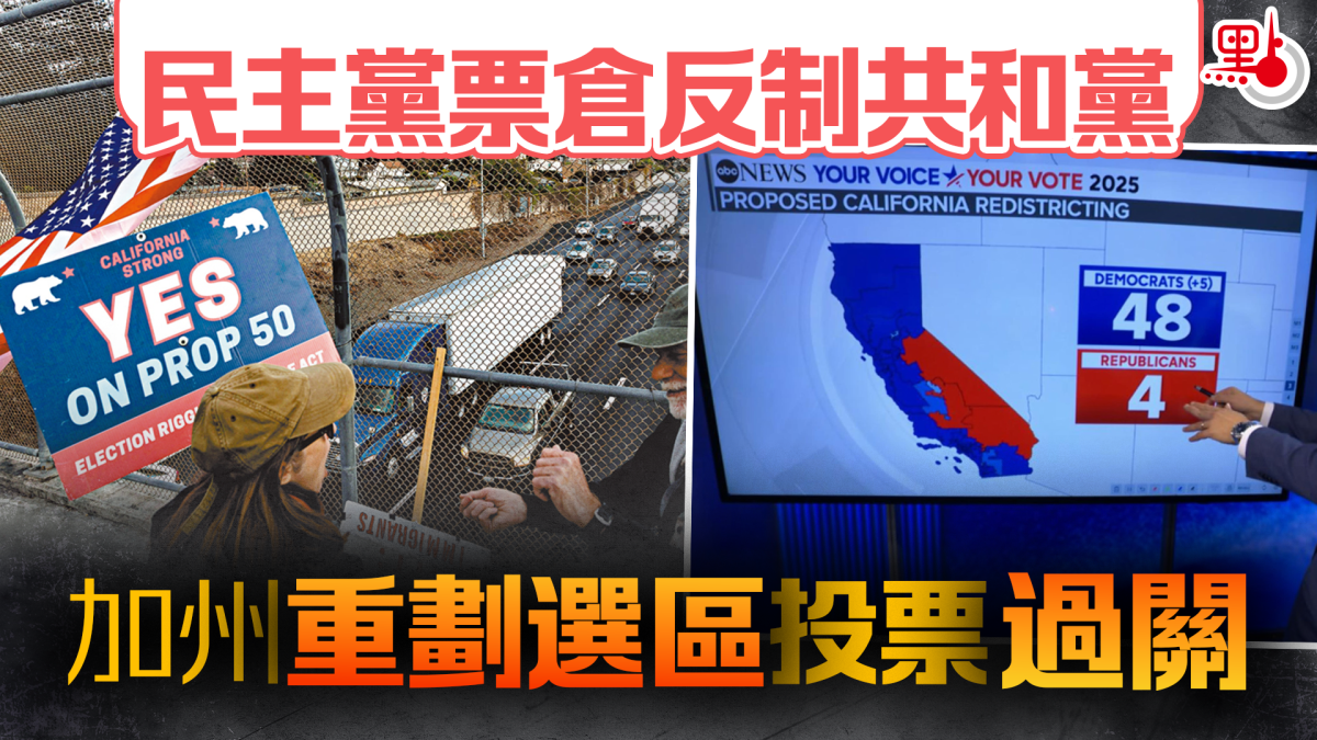 【點新聞報道】美國加州選民周二(11月4日)以壓倒性多數,通過一項被視為旨在反制總統特朗普政策的公投。這項「第50號提案」將暫時重劃該州的國會選區,點票結果顯示提案獲64.7%選民投贊成票,輕鬆過關。