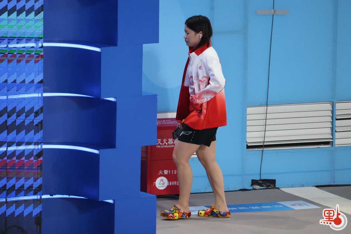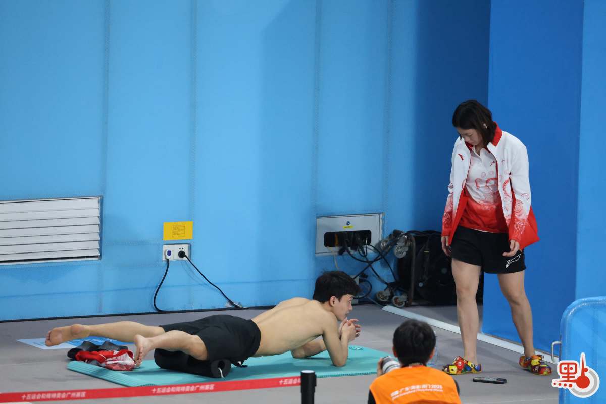 大戰在即,全紅嬋卻顯現出較為輕鬆的心態,下午3時43分,距離女子雙人10米跳台決賽開始還有2個多小時,點新聞記者在跳水館「捕捉」到全紅嬋化作「跑腿員」,為隊友送康復用的醫療肌貼的畫面。只見她一路小跑,很快將肌貼送到隊友手裏。期間,她還坐在隊友身邊,兩人輕鬆地聊天。
