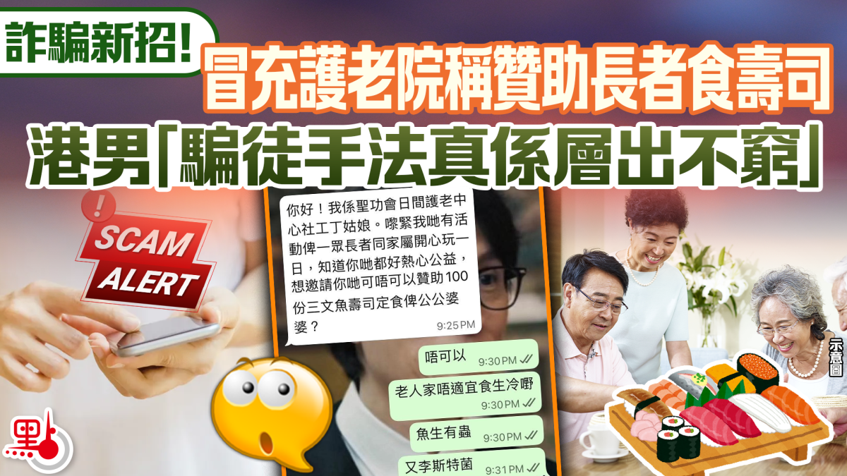 港男於Threads發帖文並上傳相片,原來樓主收到一條自稱是「聖功會」日間護老中心社工人員的短訊。該名工作人員表示,將為中心的長者及家屬舉辦1日活動,便邀請樓主贊助,「知道你哋都好熱心公益,想邀請你哋可唔可以贊助100份三文魚壽司定食畀公公婆婆?」。樓主感嘆「騙徒嘅手法,真係層出不窮」,並調侃「聖功會呢下先勁吖嘛」。從樓主上傳的相片中可見,樓主回覆對方,「唔可以,老人家唔適宜食生冷嘢。魚生有蟲,又(有)李斯特菌。」