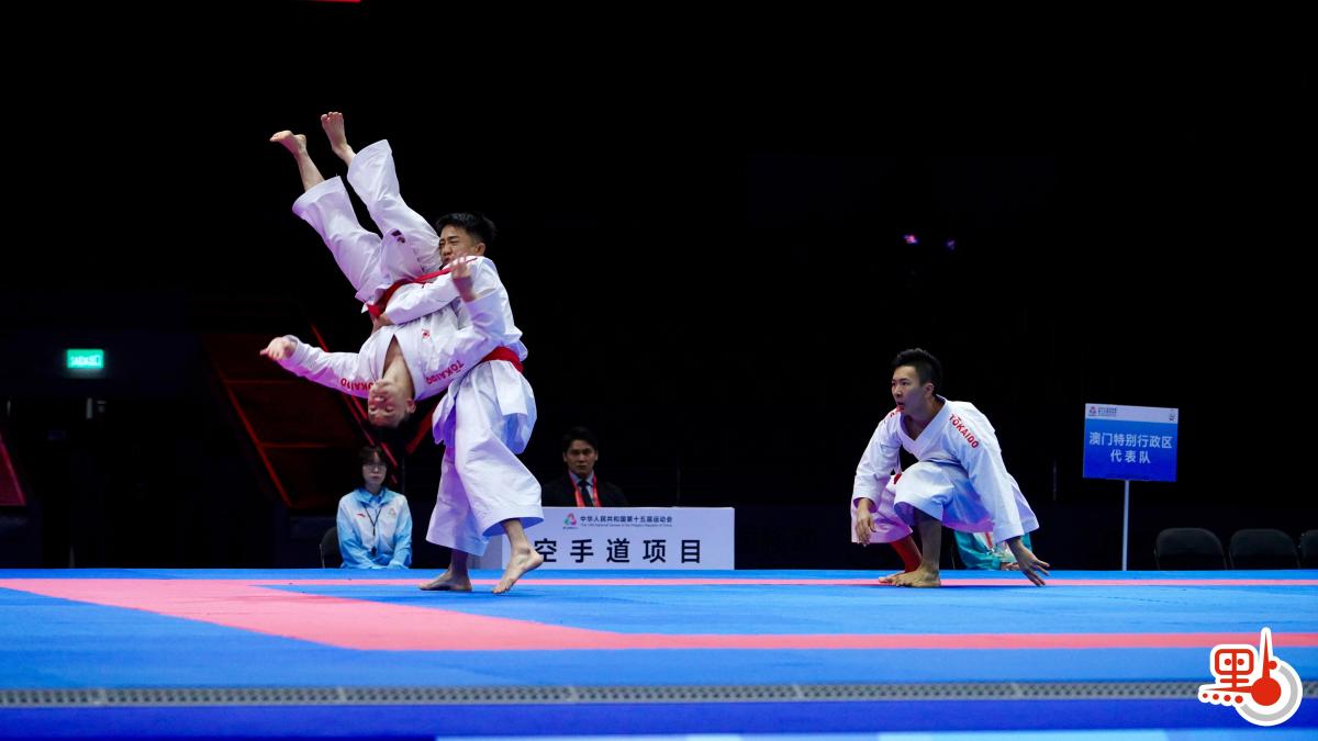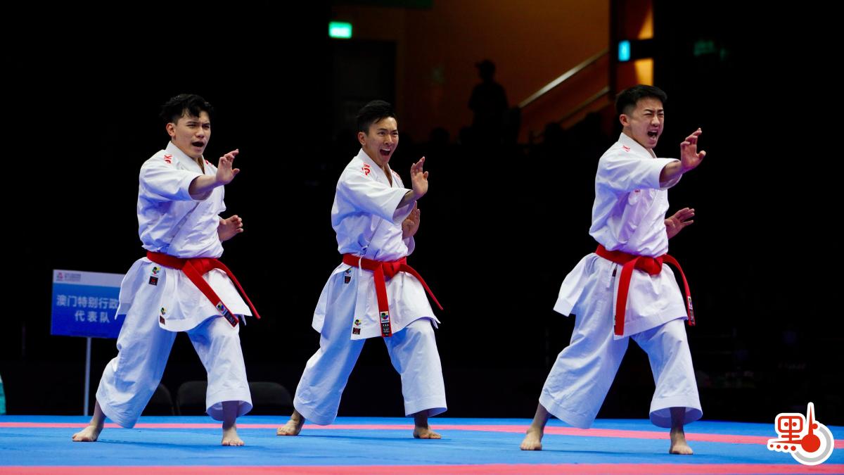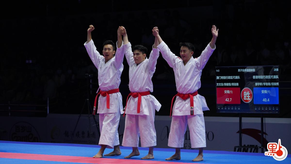 空手道比賽男子業餘組團體型決賽在傍晚舉行,在杭州亞運曾奪得銀牌的澳門隊三名運動員郭建恒、方文浩和鄭沘珞出戰,對決香港隊三名運動員鄧宇軒、李智剛、招俊然。