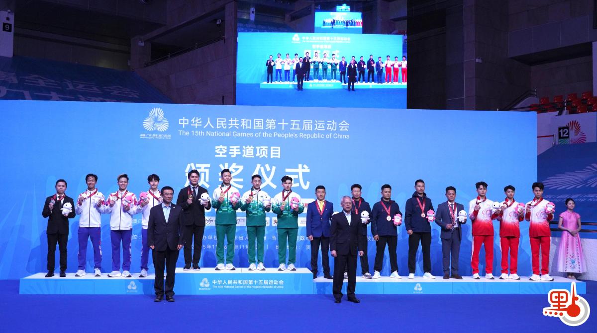 【點新聞報道】由澳門賽區承辦的第十五屆全運會空手道比賽男子業餘組團體型項目今日(6日)在澳門綜藝館舉行,澳門代表隊最終以42.7分比40.4分擊敗香港,摘得今屆全運會澳門首面獎牌。頒獎儀式由澳門特區行政長官岑浩輝主持。